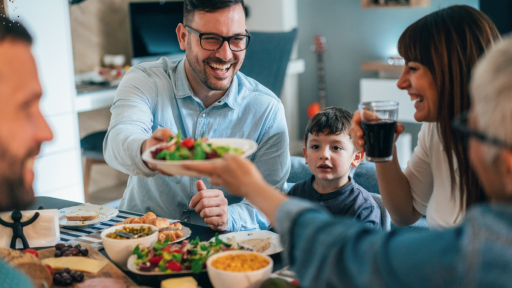 Family and friends huddled around the table talking and laughing. Some dug in for seconds while others refilled their glasses.
