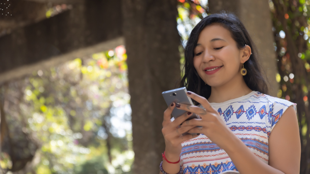 - On her phone